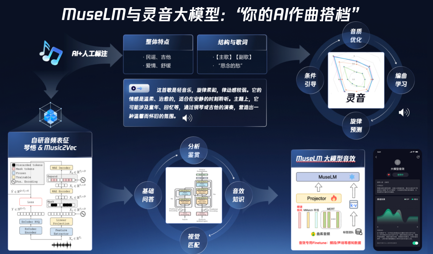 该方案集成了TME天琴实验室的核心音频AI能力,包括“琴语AI播客”、“灵音大模型”、“MuseLM音乐大语言模型”和“琴语有声书”模块,涵盖了智能播客生成、音乐内容理解与生成、文本转音频等多个关键场景,构建起覆盖内容生产全链路的AI能力体系。