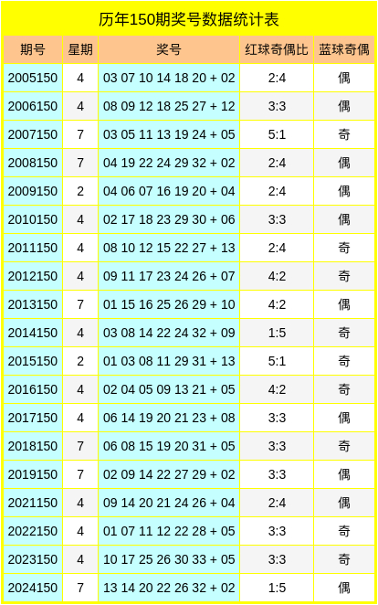蓝球:在历史第150期同期开奖中,号码奇偶比为9:10,最近5年蓝球奇偶走势为:偶数、偶数、奇数、奇数、偶数,今年预计蓝球开出奇数号码,参考蓝球号码13。