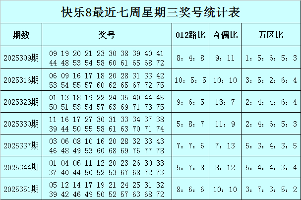 福彩快乐8第2025351期(上周三)开奖回顾:05 12 14 17 19 21 24 25 31 32 39 42 46 49 50 52 57 63 68 72,其中奖号012路比为8:6:6,奇偶比为10:10,五区比为3:7:3:5:2。