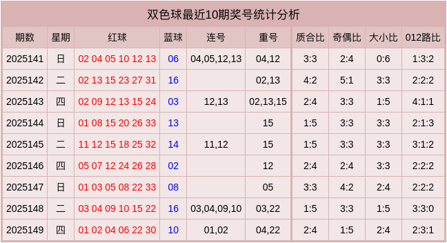 012路比分析:上期红球开出012路比为2:3:1,其中1路表现较热,最近10期红球012路比为25:20:15,本期012路比参考3:1:2。