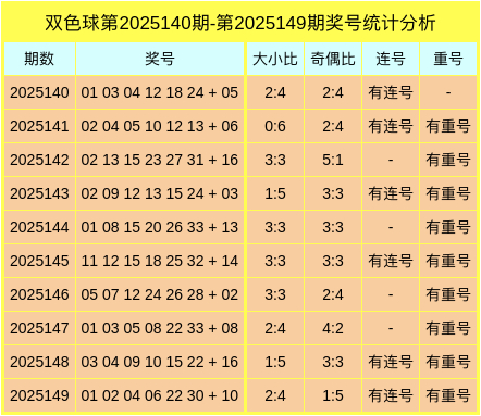 大小分析:上期奖号大小比为2:4,近十期奖号大小比为20:40,小数红球号码走势较强,本期看好大数红球号码较上期走势上升,参考大小比为3:3。