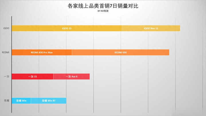 那么这些机型谁最受市场欢迎呢?1月4日行业人士“RD观测”就给出了iQOO、REDMI、一加、荣耀同类机型的首销数据对比,注意这是他们各自机型首销七天的数据对比,不是累计销量对比。结果显示iQOO 15+iQOO Neo11销量最大,REDMI K90系列排名第二,一加15+一加Ace 6排名第三、荣耀WIN系列排名第四。如果算单机型定位最高的是iQOO 15排名第一,REDMI K90 Pro Max排名第二,一加15排名第三,荣耀WIN排名第四。定位稍低一点的机型销量最好的是REDMI K90,排名第二的是iQOO Neo11、一加Ace 6与荣耀WIN RT几乎相同。