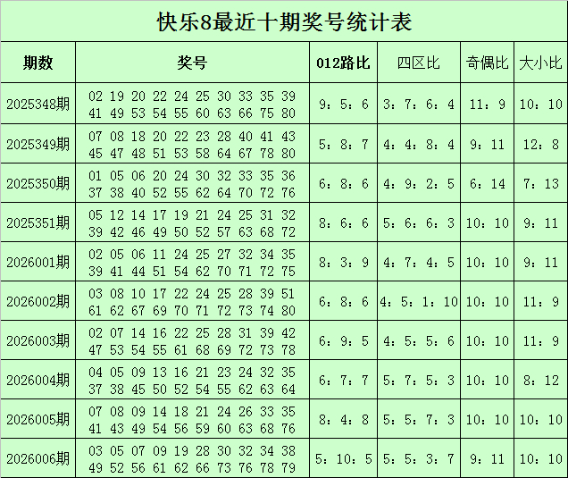 福彩快乐8第2026006期开奖回顾:03 05 07 09 19 28 30 32 34 38 49 52 56 61 62 66 73 76 78 79,其中奖号012路比为5:10:5,四区比为5:5:3:7,奇偶比为9:11,大小比为10:10。